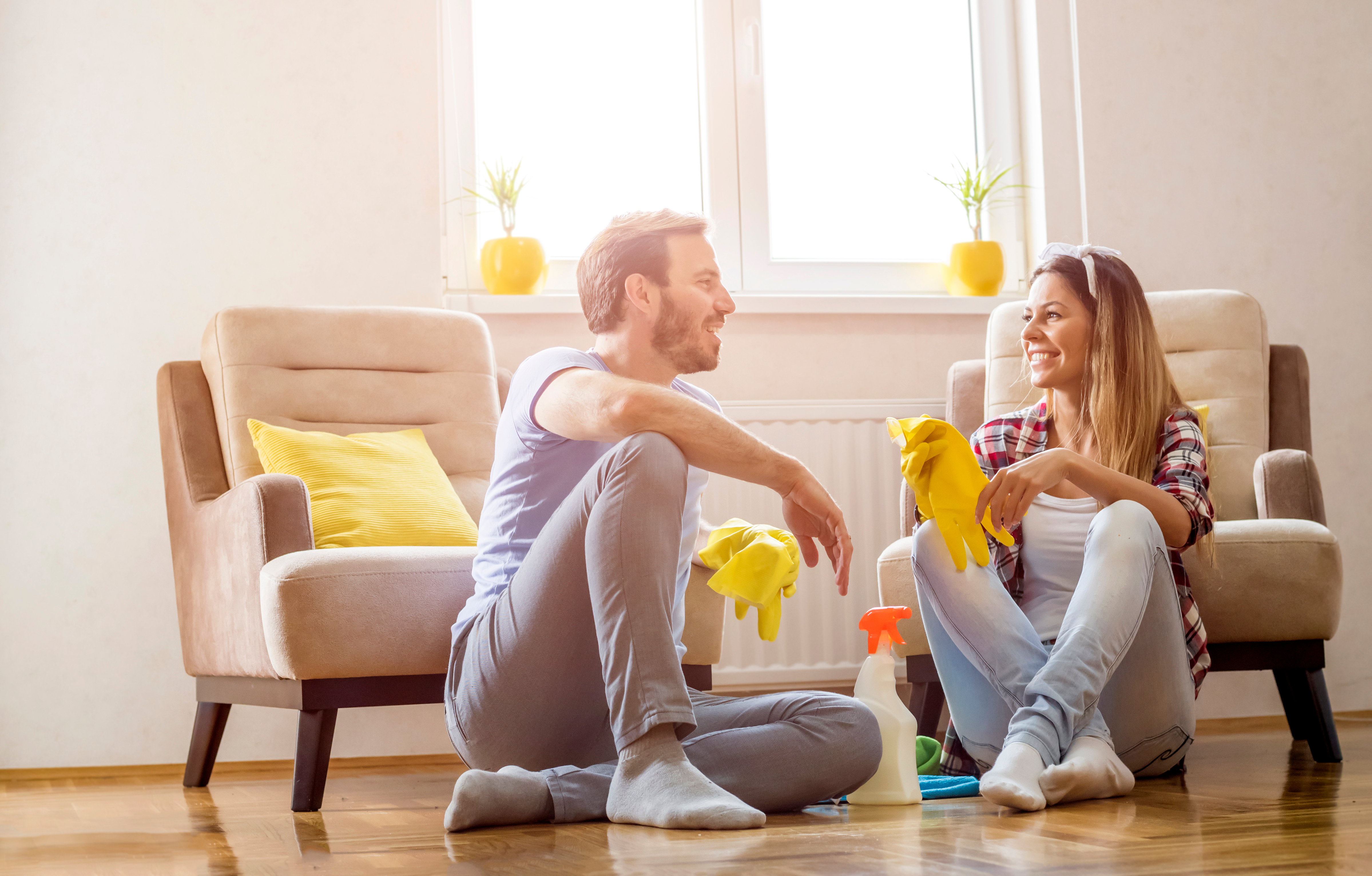Choose a cool, cloudy spring day to tackle this task (this helps to prevent streaking). Then, go round the inside of the house with a sponge, some soapy warm water and a squeegee. For the outside, remove dust and dirt with cold, soapy water and a microfiber cloth or newspaper. Then a quick spray with an exterior glass cleaner or vinegar solution (one-part white vinegar and two parts water) and a squeegee to dry, and it’s done.