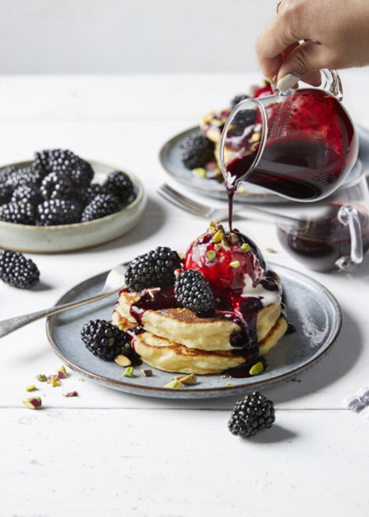 Fluffy pancakes with blackberry sauce