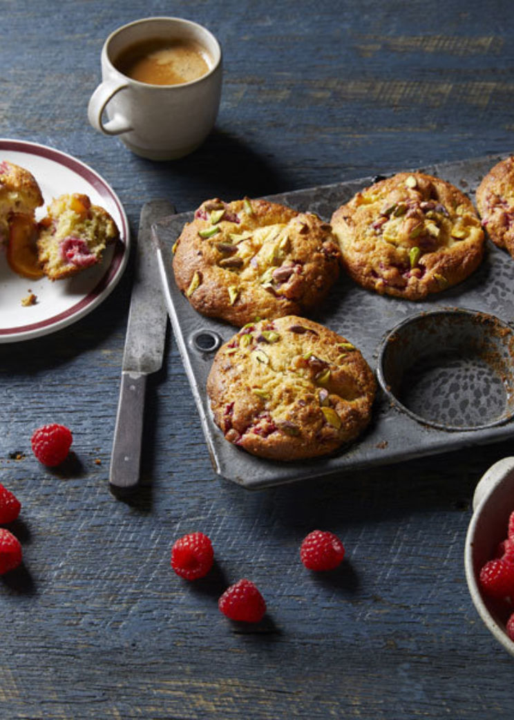 Raspberry, peach & pistachio muffins