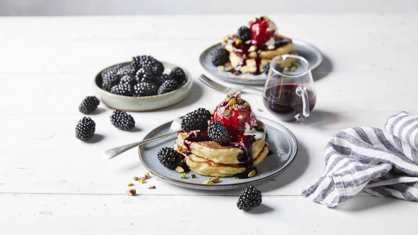 Fluffy pancakes with blackberry sauce