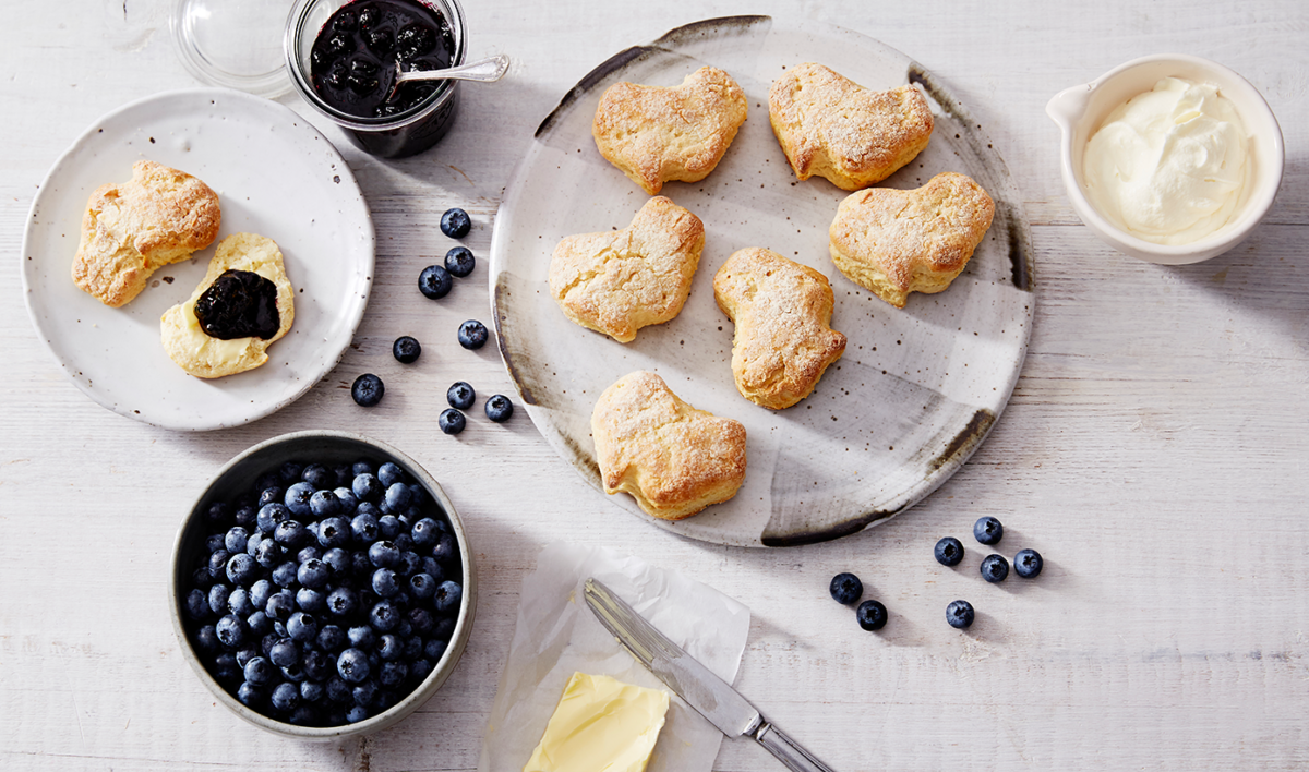 Dip a 5 cm round or similar sized Australian themed cookie cutter into flour and stamp out shapes. Press the offcuts back together and stamp out remaining shapes. Arrange 2 cm apart on the prepared tray. Dust the tops with flour. Bake for 15 minutes, until golden brown and the bases, sound hollow when tapped. Leave on the tray for 10 minutes, to cool slightly. Serve warm or at room temperature with butter, blueberry jam and whipped cream, if desired. The damper is best eaten on the day it is made.