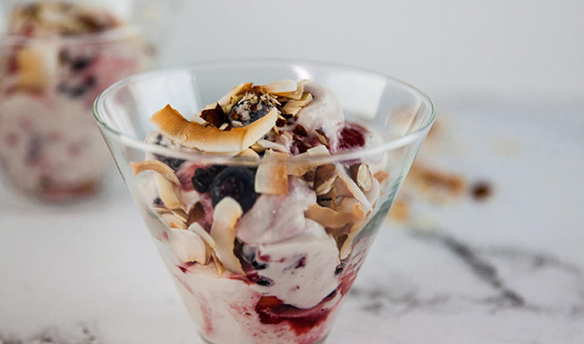 Dollop the berry mixture around the cream and carefully fold through a few times to create a ripple. Divide half of the mixture between 4 glasses then top with half the coconut and almonds then top with remaining cream mixture and top with remaining coconut and almonds.