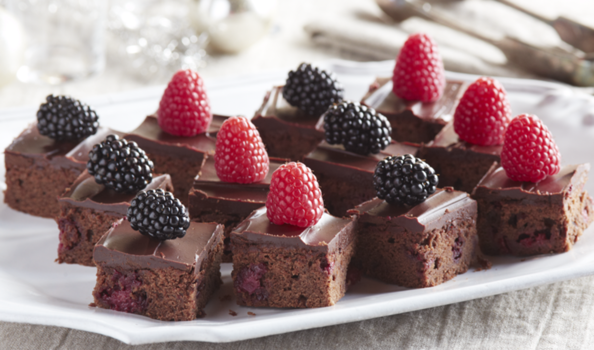 Bite into this cocoa-based brownie with bursts of chopped blackberries. Topped off with a perfectly spread silky, rich, truffle-like ganache and you'll be in heaven.