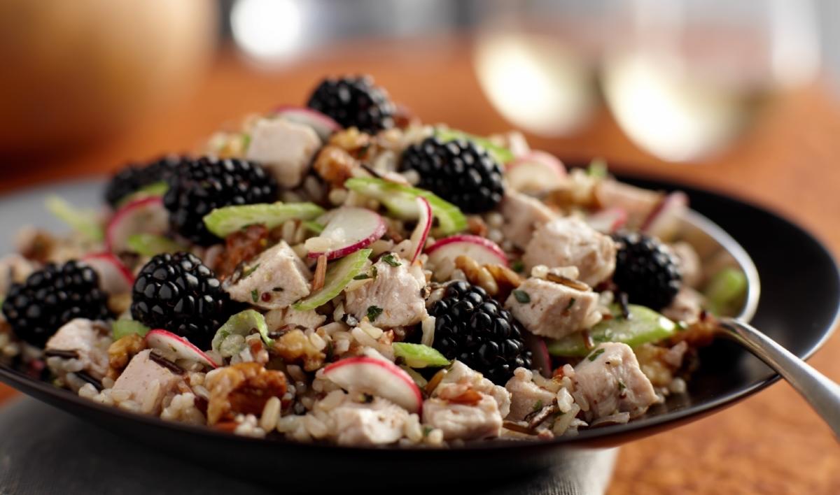 Mix blackberries, rice, turkey, celery, radishes and walnuts in a medium bowl. Stir in just enough vinaigrette to moisten salad. Server or refrigerate until serving.