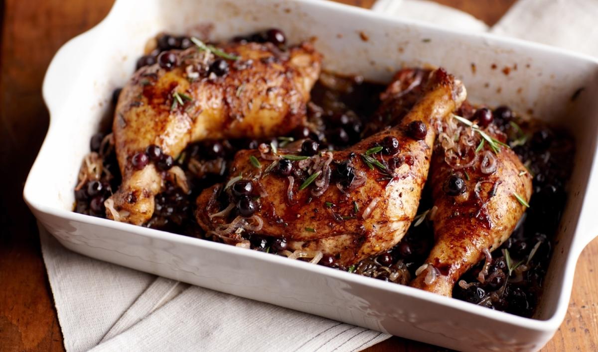Pour the blueberry balsamic mixture over chicken and put baking dish in the top half of the oven for about 10 minutes, until the chicken has cooked through to a temperature of 75°c.