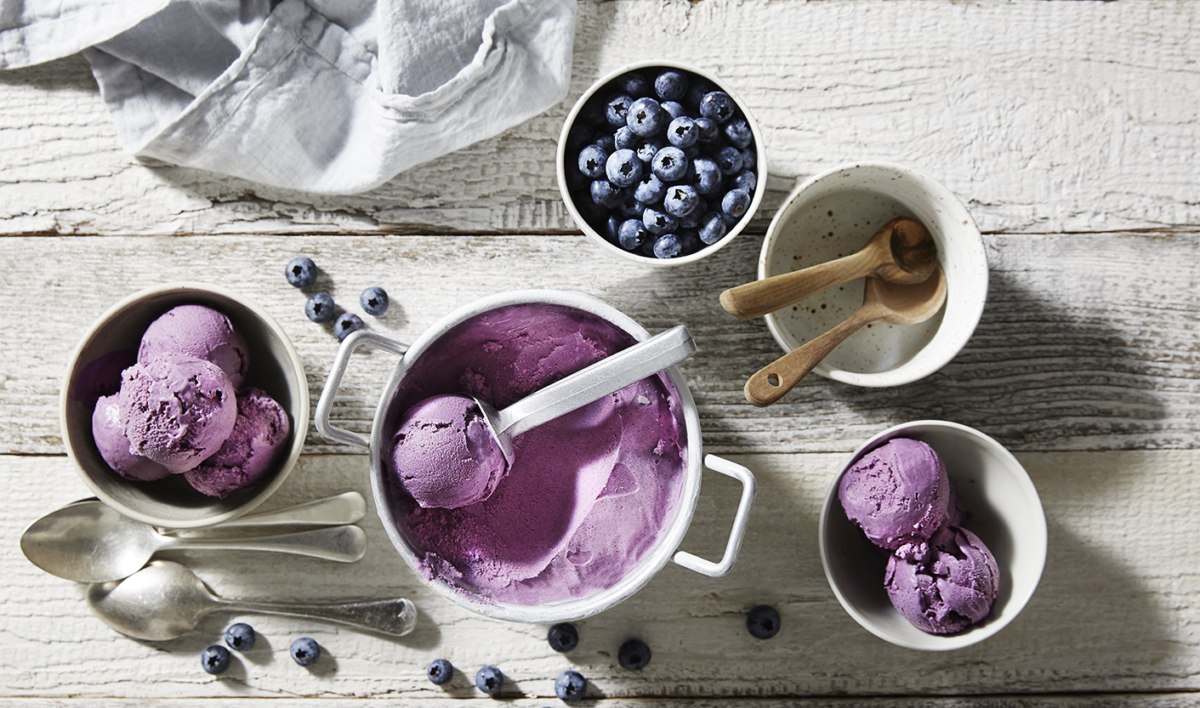 Pour blueberry custard into an ice cream machine and churn according to manufacturer’s instructions. Transfer into a 1-litre capacity container. Cover with plastic wrap. Freeze for at least 2 hours, or overnight. **If you don’t have an ice cream machine, pour the custard into a stainless-steel bowl and freeze for 45 minutes, or until ice crystals begin to form around the edge. Whisk the mixture to incorporate crystals. Repeat whisking every 30 minutes for the next 3 hours, to prevent large ice crystals from forming, until the mixture becomes thick. Pour into a 1-litre capacity container. Cover with plastic wrap. Freeze for at least 4 hours, or overnight.
