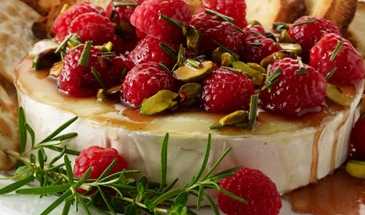 Pour raspberry mixture over warm cheese. Serve at once, with crackers for spreading.