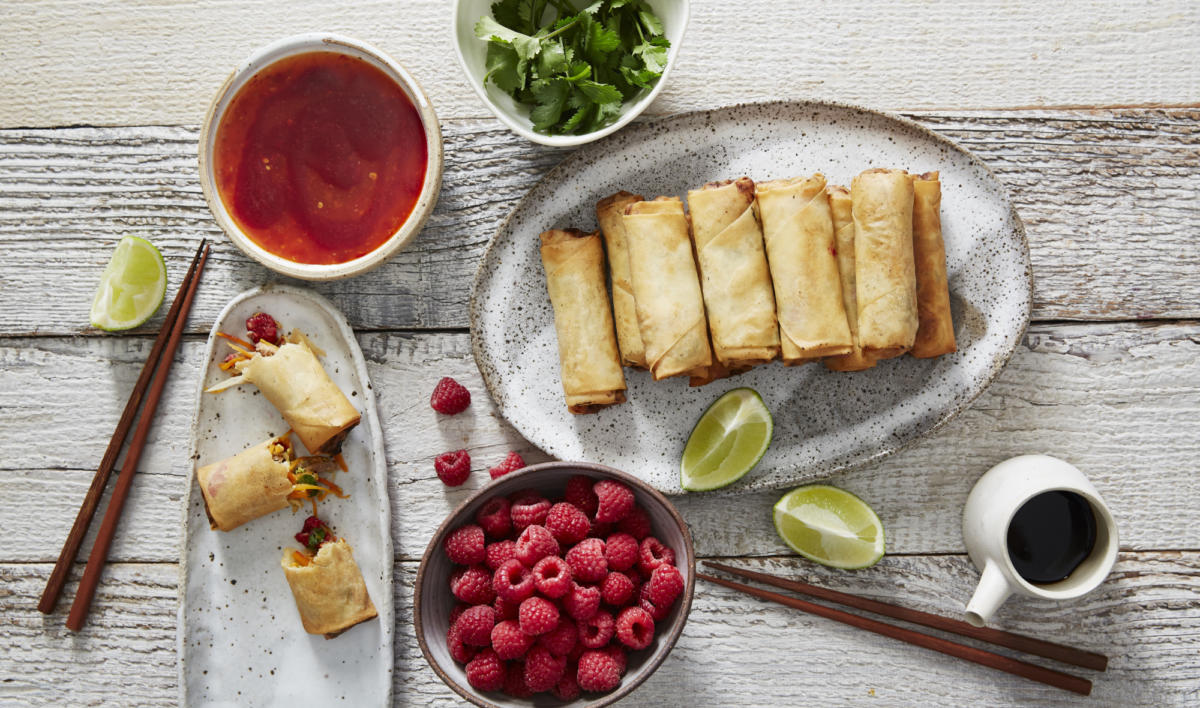 Once filling is cooled, add duck, raspberries and coriander and stir to combine. Season with salt. Trim spring roll pastry, by 2cm on two opposite sides. Blend the water and flour together in a small cup and set aside. Divide filling into twenty portions. Spoon 1 portion onto the corner of a spring roll pastry sheet and roll up, folding in the sides to enclose filling. Seal end with a little flour paste. Repeat with the remaining filling and spring roll sheets.