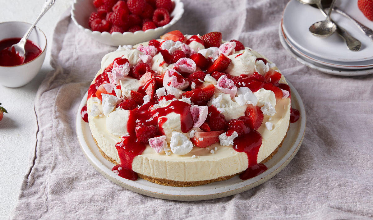 Turn a simple white chocolate cheesecake into a show-stopping dessert. The vibrant topping of raspberry coulis, fresh berries, cream and meringue sets off the cheesecake perfectly.