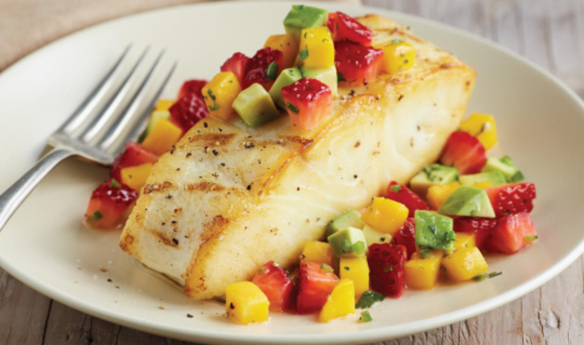 Grill fillets for 4-5 minutes, skin side up with grill lid closed. Then turn fillets over gently, and grill for an additional 3-5 minute or until fillets are cooked through. Place fillets on serving plates, then garnish fillets with fresh lime juice. Stir the strawberry-mango salsa gently and garnish fillets with the salsa.