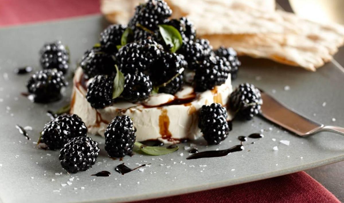 A tub of mascarpone turns into a sophisticated spread when topped with a simple mixture of balsamic vinegar, brown sugar, blackberries and basil. Serve with crackers and guests will be left wondering how you put together this amazing combination.