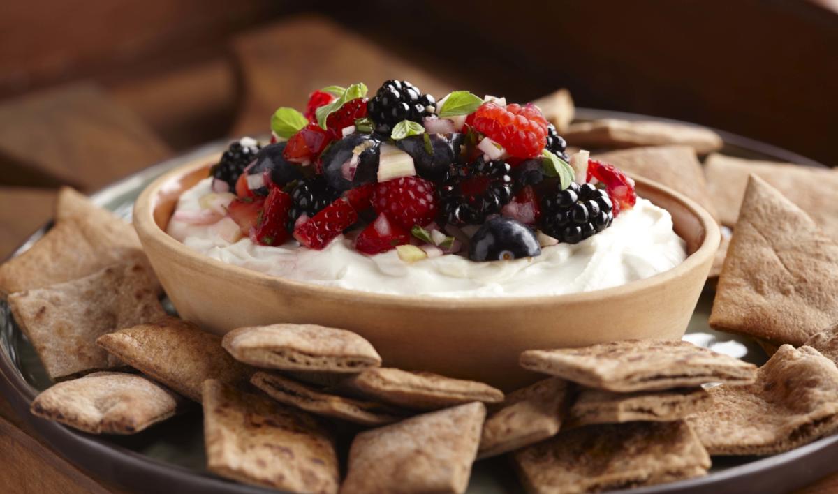 A mixture of berries and salsa ingredients makes a tangy twist for a rich goat cheese fondue. The blend of berries and cheese is a delicious dip for pita chips.
