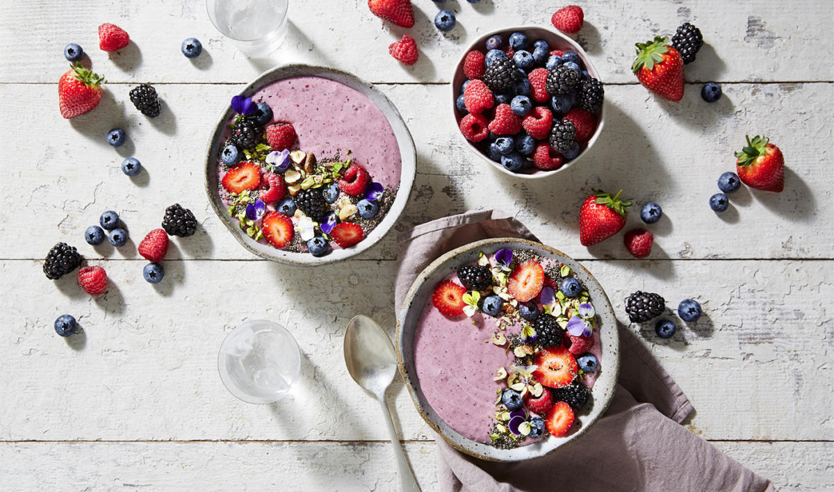 Oh-so-good for you and full of flavour, this smoothie bowl is packed with vitamins and nutrients, giving you a great energy boost. With a pretty scattering of berries, nuts and edible flowers on top, it looks gorgeous, too.