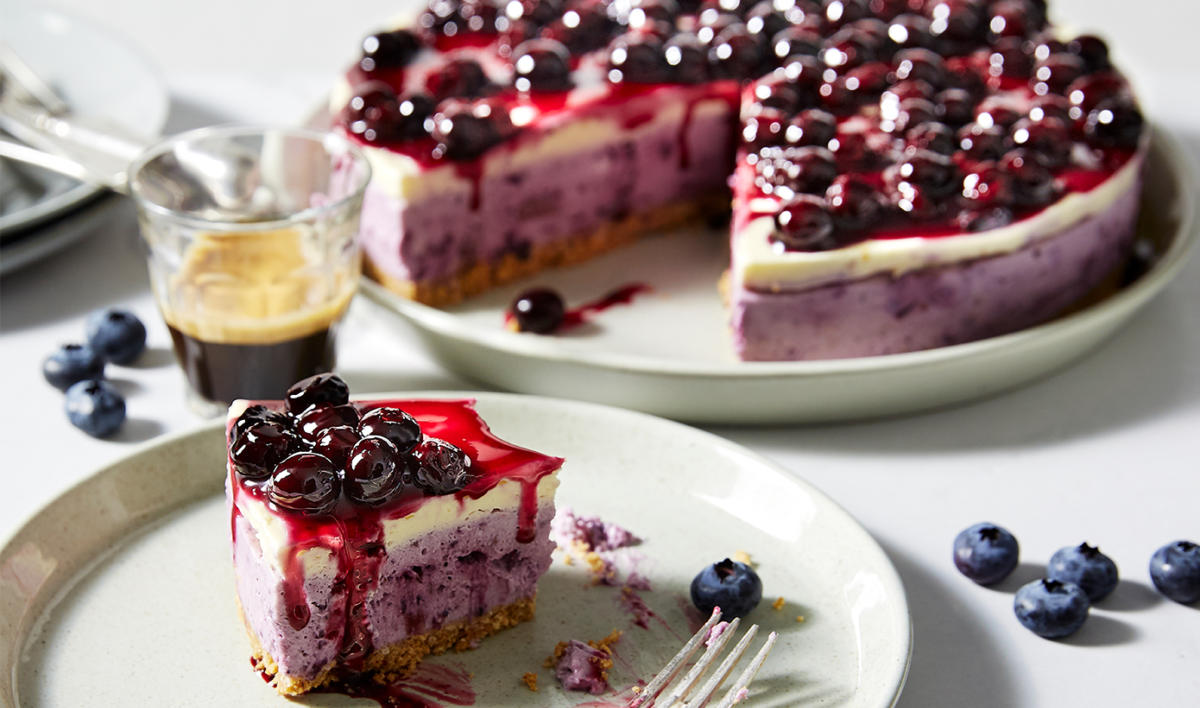 Once cooled, pour the blueberry sauce over the cheesecake, spreading to cover the entire surface. Refrigerate for at least 4 hours, or overnight. To serve, slice with a hot knife. Alternatively, for a quicker option try a plain blueberry cheesecake; simply add the blueberry puree to all of the cream cheese mixture. Pour into the base and set in the refrigerator. Serve plain or top with blueberry sauce, if desired.