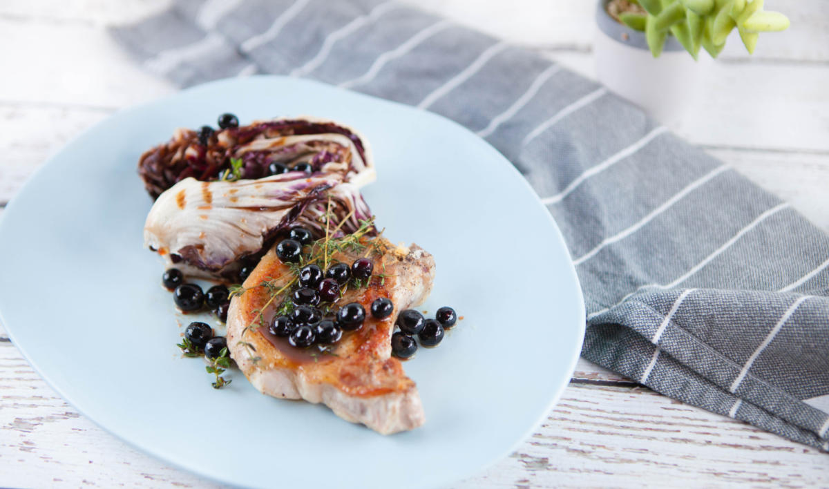 Juicy, baked pork cutlets topped with a blueberry vino dressing that is sure to please! This quick weeknight meal paired with radicchio will add some sophistication to your dinner. Recipe by: Justine Schofield, Everyday Gourmet