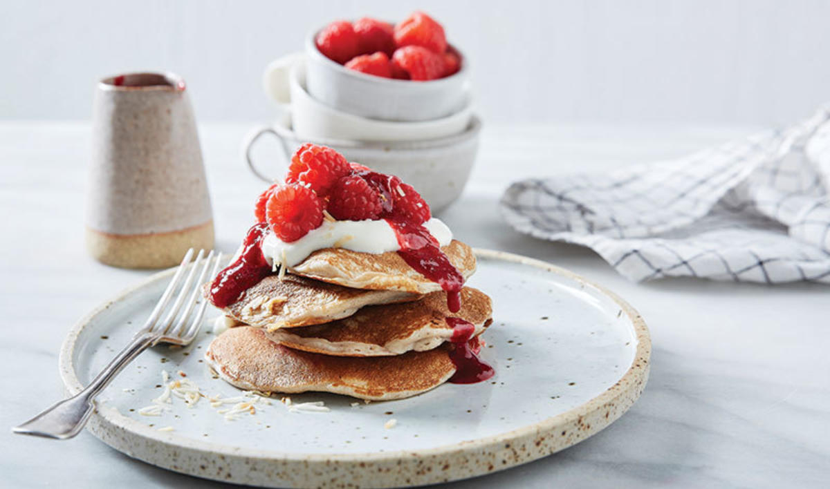 To serve, stack four pancakes onto each serving plate. Top with yoghurt, raspberry sauce, fresh raspberries and toasted coconut.