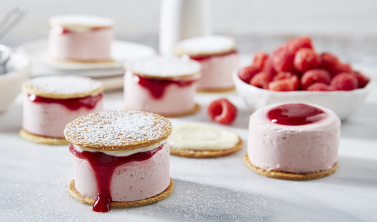 To assemble, spread approximately 1 teaspoon of the cream cheese spread onto the pastry discs. Press ice cream out of silicon moulds. Place ice cream onto six of the pastry discs and top with approximately 1 teaspoon of raspberry sauce. Cover with remaining pastry discs and dust with icing sugar. Serve immediately.