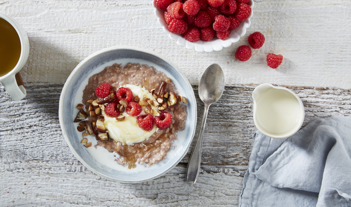 Serve porridge with milk. Top with yoghurt, remaining raspberries and dates and almonds, drizzle with honey.