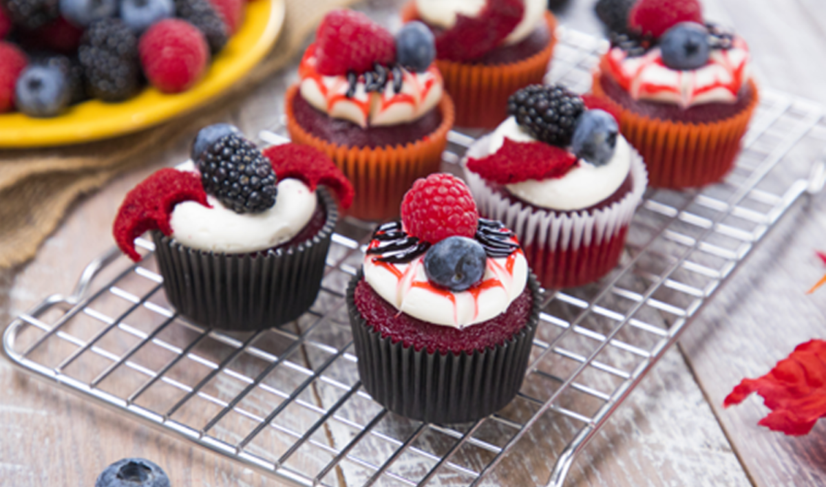 Front cupcakes with white and pink cream cheese frosting. Pipe concentric circles on top of cupcakes with alternate colour frosting or raspberry reduction. Use a toothpick to gently drag icing from centre to outside edge to create spider web design. REMOVE one cupcake top with a serrated knife and Cut bat wings from top of cupcake. Use blackberries, blueberries, raspberries and, decorating gel to create spiders or bats. Dip edges of cupcakes in sprinkles to finish edges. Serve immediately.