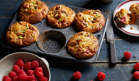 Place 2 ½ cups self-raising flour into a large bowl. Add 2 tablespoons cocoa powder, 1 teaspoon baking powder, 1 teaspoon baking soda, and 1/2 teaspoon salt. Whisk to combine ingredients and Set aside flour mixture. Press raspberries through a fine-mesh sieve into a small bowl and discard seeds. Measure out 1/3 cup of puree and place into a separate small bowl. (Reserve remaining puree for frosting and set aside) Add 3/4 cup buttermilk, 1 tablespoon red food colouring, and 1 teaspoon vanilla extract and mix. Set aside raspberry mixture. Place 1 ¾ cup granulated sugar into the bowl of an electric mixer. Add butter. Mix ingredients 5 minutes or until light and fluffy. Add 3 eggs, one at a time, with mixer on low speed and scrape down sides of the bowl as needed. Slowly add the raspberry mixture and flour mixture. Divide batter evenly between prepared muffin cups.