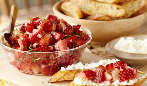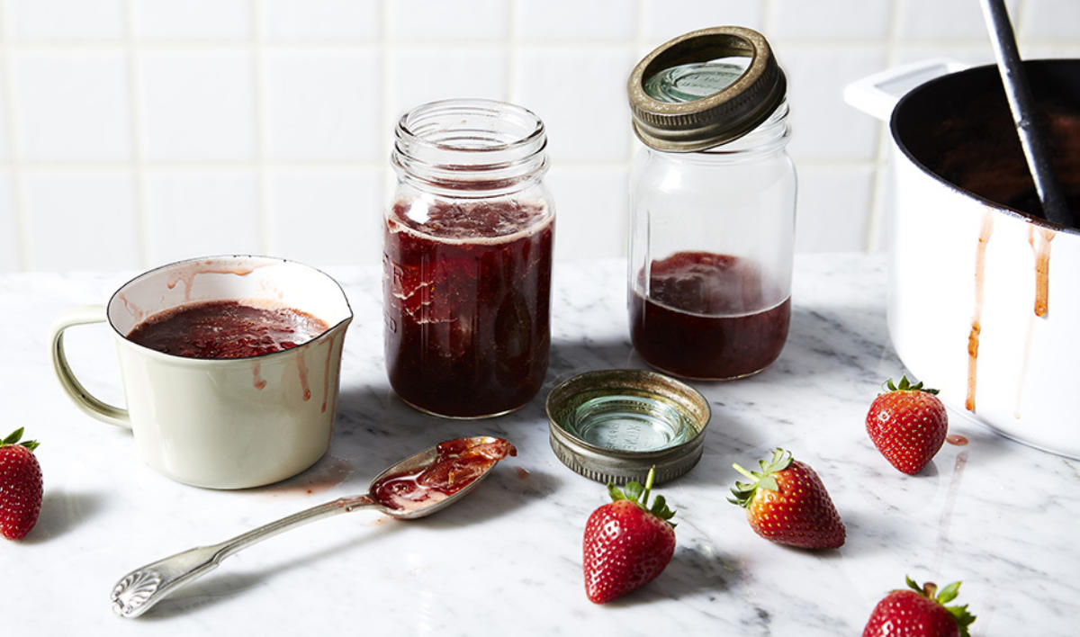 Create a jewel-like jar of vibrant strawberry jam using plump, fresh strawberries, a few squeezes of tart lemon juice and some strips of green apple peel. It won’t last long – particularly if scones or crumpets are on the menu