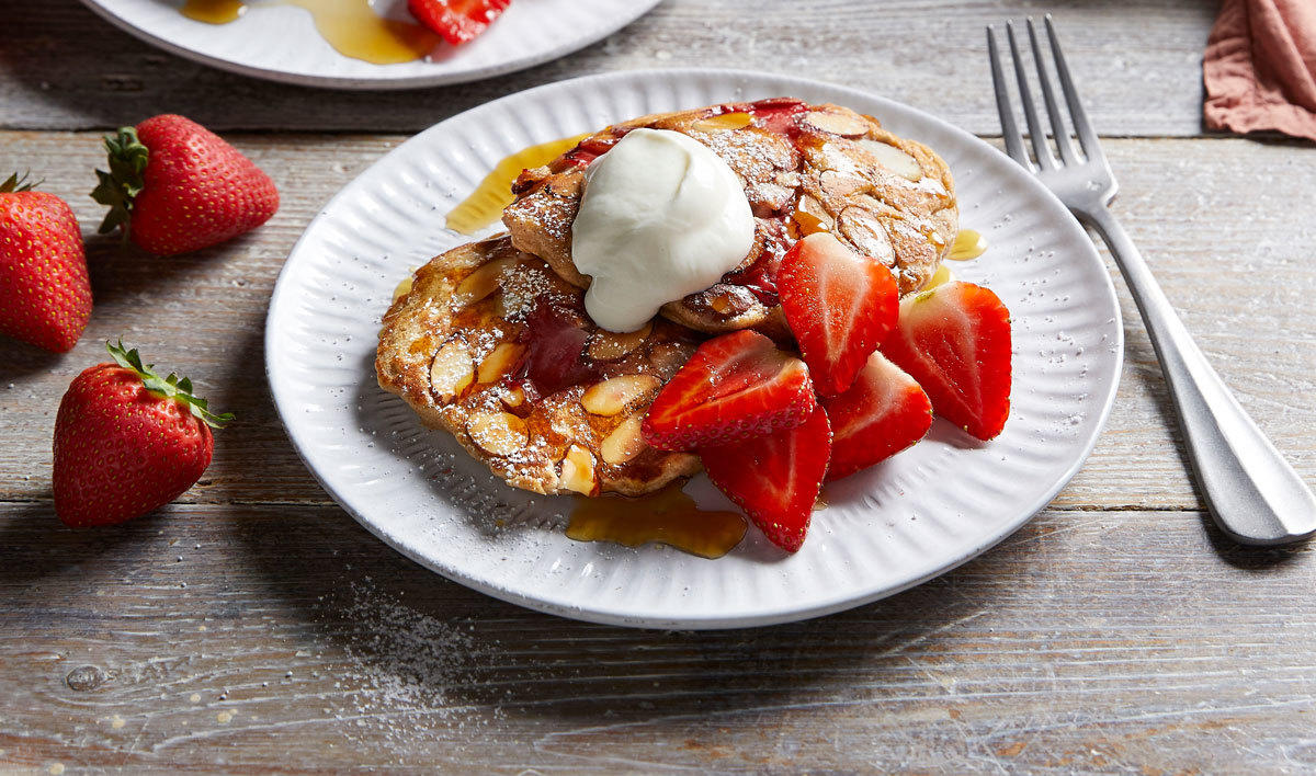 Preheat a large non-stick frying pan over low-medium heat. Wipe the pan with some paper towel dipped in butter, to lightly grease. Scatter flaked almonds at intervals in the frying pan, to make approximately 10 cm discs. You should be able to fit three in a large frying pan. Arrange three to four strawberry slices (depending on the size of your strawberries) onto each disc. Pour ¼ cup (60 ml) of the batter over each almond and strawberry dish, spreading to cover the almonds and strawberries. Lay more strawberry slices on top and scatter with flaked almonds. Cook for 2 minutes, or until bubbles appear and begin to pop on the surface and the edges start to cook and lose their sheen. Using a spatula, flip and cook for 1-2 minutes on the other side, until golden brown. Once cooked place pancakes on a baking tray in a single layer and keep warm in the oven, while you cook the remaining pancakes.