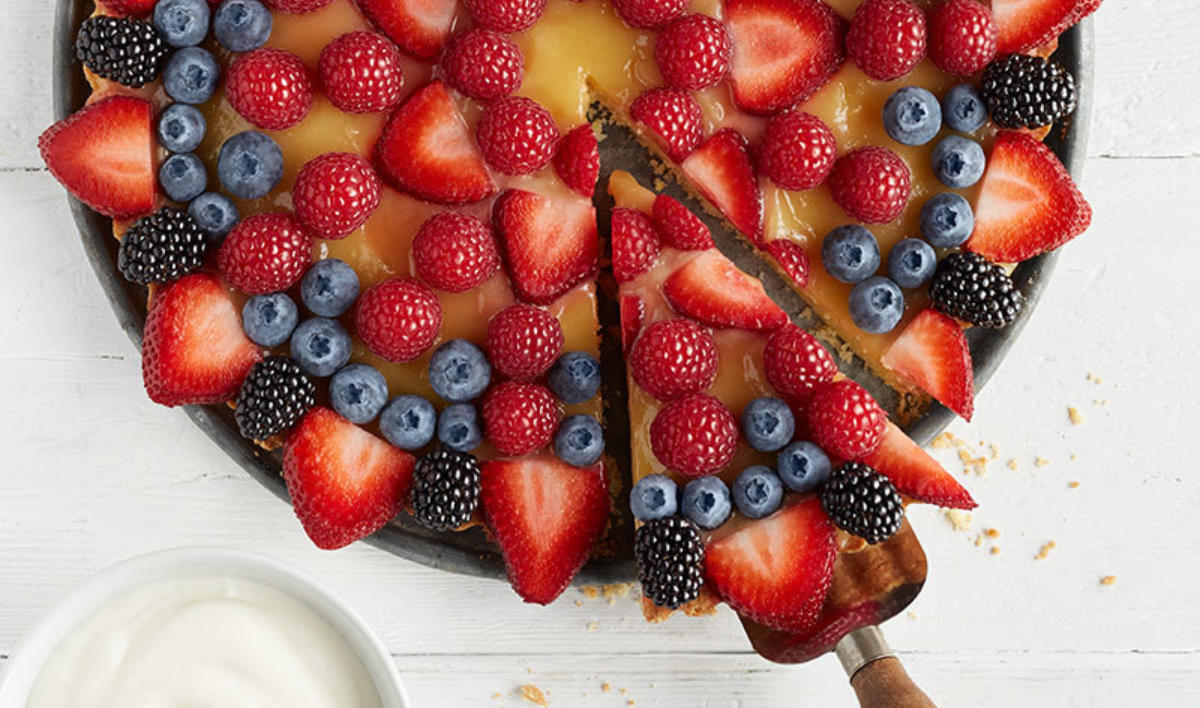 Spread the lemon curd on top of the crust to the edge of the crust. Now it’s time to have fun arranging the strawberries, blackberries, blueberries and raspberries in concentric circles. Refrigerate until you are ready to serve. For a much easier cut, use a small serrated knife.