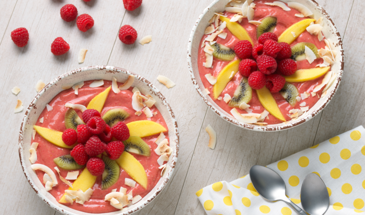 Pour smoothie into a medium-sized cereal bowl. Garnish with kiwi, mango, toasted coconut, and reserved raspberries. Then serve immediately.